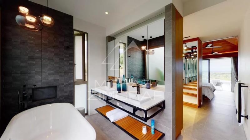 Entdecken Sie diese prächtige, zeitgenössische Villa mit einer Wohnfläche von 696 m², die einen atemberaubenden Panoramablick auf den Ozean bietet. Gelegen in einer gesicherten Wohnanlage in Bel Ombre, an der Südwestküste von Mauritius, bietet diese geschmackvoll eingerichtete Immobilie ein luxuriöses Wohnambiente inmitten unberührter Natur, zwischen Meer und Bergen. Die Villa verfügt über 5 großzügige Schlafzimmer, alle mit eigenem Bad, die den Bewohnern Privatsphäre und Komfort bieten. Das Erdgeschoss beeindruckt mit einem großzügigen, lichtdurchfluteten Wohnbereich, hohen Decken und großen Panoramafenstern. Hier befinden sich zudem ein Gästezimmer, eine voll ausgestattete offene Küche, ein Wohn- und Essbereich sowie eine stilvolle Bar, ideal für gesellige Abende. Der Wohnbereich öffnet sich auf eine wunderschöne Terrasse mit Infinity-Pool, die einen spektakulären Blick auf den Ozean freigibt. Auf der gegenüberliegenden Seite sorgt ein liebevoll angelegter tropischer Patio für eine entspannende Atmosphäre. Im Erdgeschoss befinden sich außerdem drei weitere Schlafzimmer mit eigenem Bad, ein Büro, ein TV-Raum sowie die exklusive Master-Suite. Diese bietet eine private Terrasse mit traumhaftem Meerblick, einen begehbaren Kleiderschrank sowie ein Badezimmer mit Innen- und Außendusche. Zur Villa gehören zudem eine Garage, ein 24/7-Sicherheitsdienst und ein direkter Zugang zum Meer. Hochwertige Materialien und edle Oberflächen verleihen der Immobilie eine außergewöhnliche Eleganz und Exklusivität. Als Eigentümer genießen Sie den Zugang zu den luxuriösen Einrichtungen zweier benachbarter 5-Sterne-Hotels, darunter exklusive Restaurants, ein Spa, ein Beach Club und zwei Golfplätze.Informationsanfrage