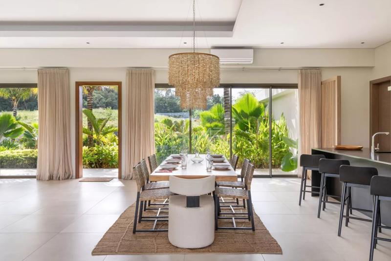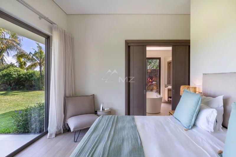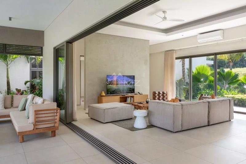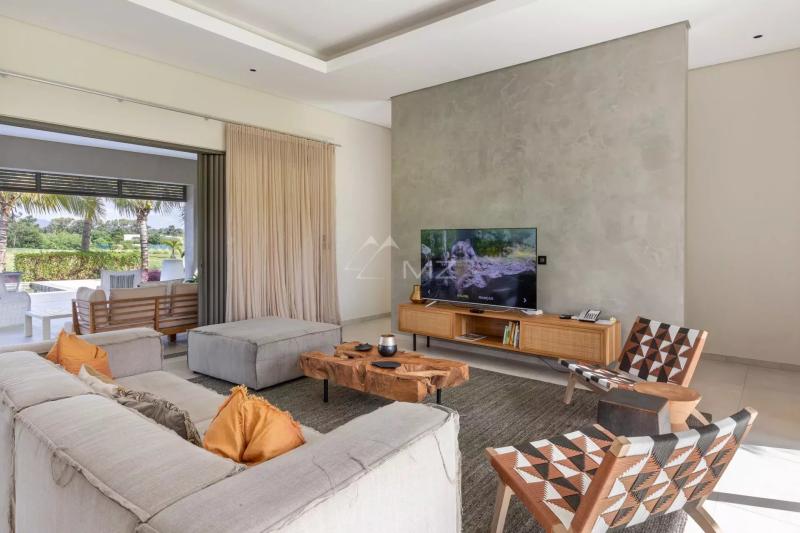 Escape between golf and the lagoon in the Rive Est district. Situated on a magnificent plot of 2514 m², this villa offers a spectacular and breathtaking view of the manicured fairways and the surrounding mountains. It also benefits from the proximity of a green park and its pontoon, providing direct access to the lagoon. Recently built and single-story, this contemporary villa of 444 m² has generous living spaces that open onto a magnificent 15-meter-long terrace. Thanks to large windows, the interior and exterior seamlessly and harmoniously connect. It comprises four bedrooms with en-suite bathrooms, dressing rooms, and an outdoor shower for the master suite. The modern and equipped kitchen opens onto the indoor living room, which extends into a very spacious and cozy lounge. Sheltered from the general winds and facing west, the huge veranda furnished with an outdoor living and dining area, overlooks the 48 m² natural stone swimming pool. The elegant decoration, in soft and natural tones, was created by an interior designer. Finally, for absolute comfort, a spacious utility room, numerous storage spaces, and a closed garage with a separate area complete the features of this property.Request for information